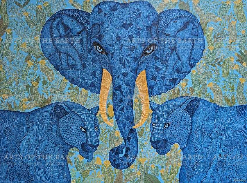 The Gonds are a tribal community widely spread over Madhya Pradesh, Chattisgarh, and also some parts of Maharashtra, Andhra Pradesh and Orissa. Gonds call themselves Koi or Koitur, which means unclear. They are one of the largest tribes of India. Gonds have been greatly influenced by the culture and traditions of the Hindus. They are worshippers of Janani. They also worship Pharsa Pen in the form of a nail or a piece of iron chain. Like the Santhals, the Gonds believe that everything in nature is inhabited by spirits and they need to be appeased with sacrifices. On such occasions, the priest or devari perform the necessary rituals. Gond paintings are created on the walls of their dwellings and besides being decorative, they are expressions of their religious beliefs and sentiments. The themes are closely linked with their daily lives, and depict their local festivals and Gods, as well as objects and creatures present around them. However, they have now started painting on paper and canvas as well. The painters use a technique creating textures with patterns. Gond paintings have an uncanny likeness to Australian aboriginal art. In both these art forms, the brush moves creating dots or lines as fillers. Gond paintings have great universal appeal.