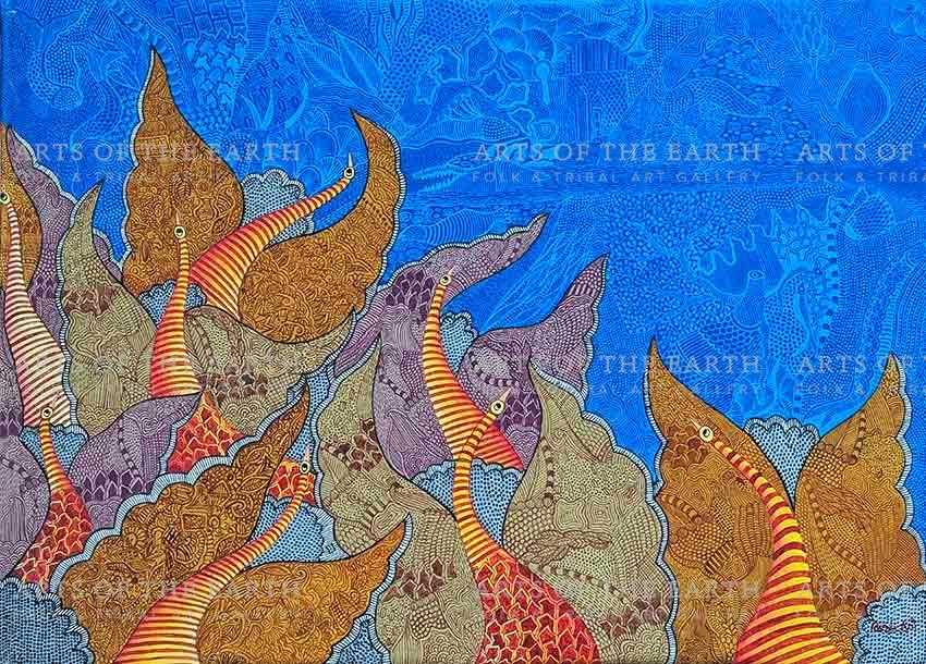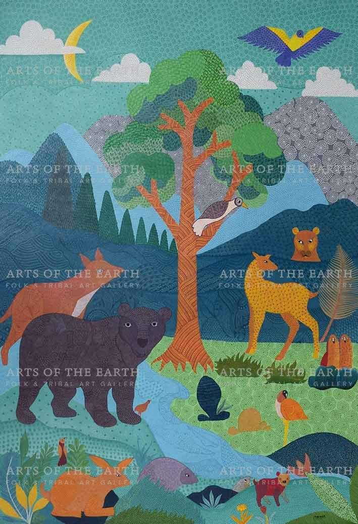 Kishan Uikey is a Gond artist. The Gonds are a tribal community widely spread over Madhya Pradesh. Gond paintings are created on the walls of their dwellings and besides being decorative, they are expressions of their religious beliefs and sentiments. The themes are closely linked with their daily lives, depict their local festivals, and present them as objects. However, they have now started painting on paper and canvas as well.