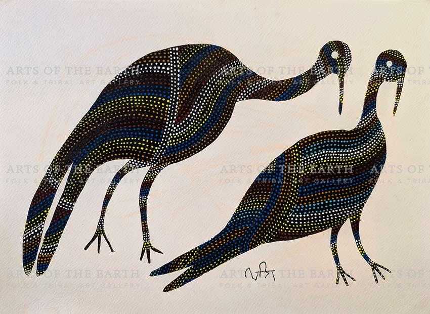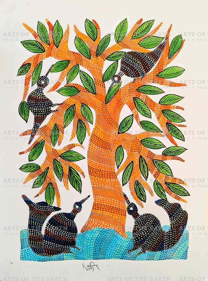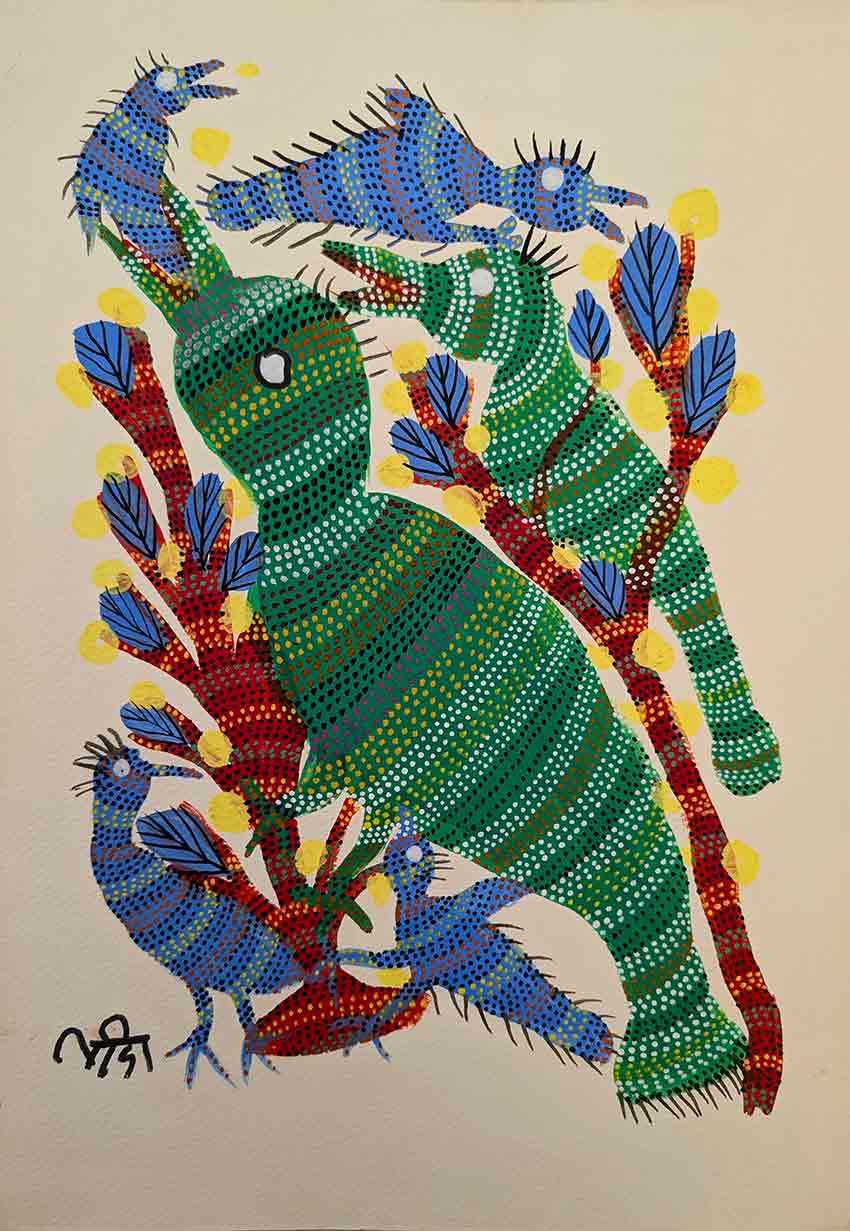 She has been part of several group exhibitions such as ‘Creative Customs: International Folk Art,’ Peninsula School of Art, USA (2016); ‘water+wisdom Australia-India,’ Royal Melbourne Institute of Technology, Australia; and solo shows such as ‘Merging Narratives,’ Ojas Art Gallery, Delhi (2022). Her works are part of several prestigious art collections, such as the Indira Gandhi National Center for the Arts, Saffronart in Mumbai, the National Handicrafts and Handlooms Museum in New Delhi, and the Sutra Gallery in Wisconsin, USA. In 2017 she received the Master Ojas Art Award at the Jaipur Literature Festival, solidifying her position as a leading figure in the Bhil art movement. The Indira Gandhi National Center for the Arts, Saffronart in Mumbai, the National Handicrafts and Handlooms Museum in New Delhi, and the Sutra Gallery in Wisconsin, USA. She is currently based in Bhopal.