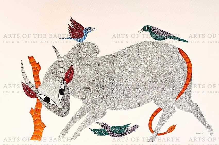 Vijay Uikey dropped out of school early & took to Gond because he had a natural flair for it. He comes from a family of traditional Gond artists who had turned to various professions to sustain themselves.