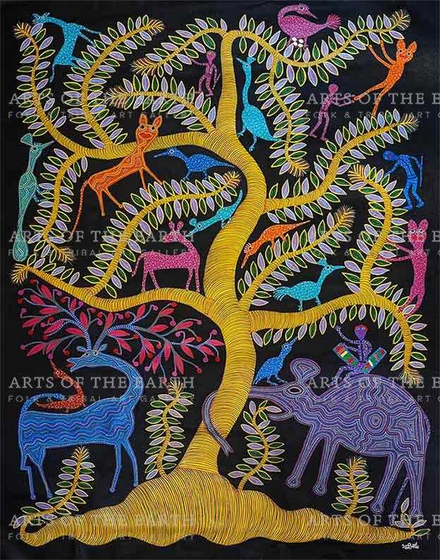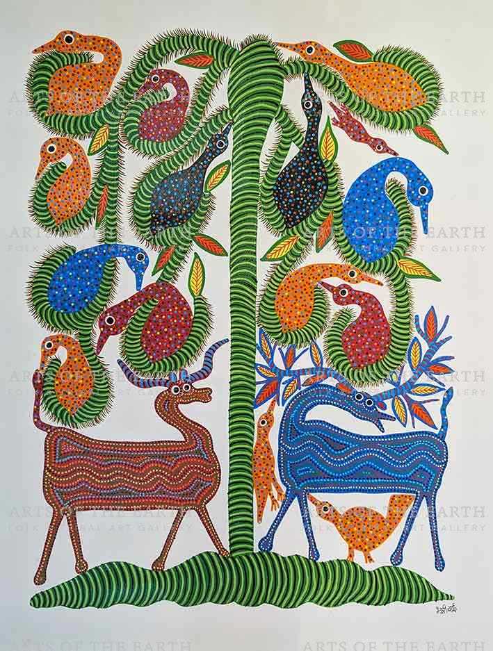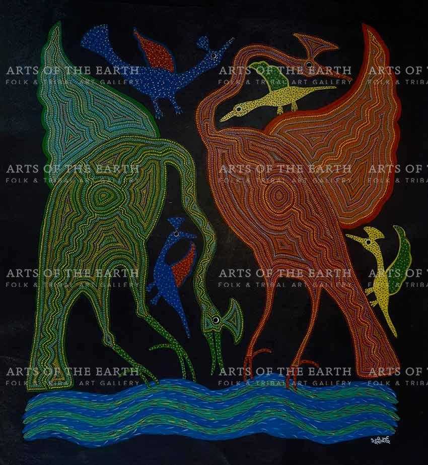 Bhuri Bai is an internationally known practitioner of the Bhil folk art form, Bhuri Bai is a native to the state Madhya Pradesh. During the initial days of her paintings, Bhuri drew motivation from the time spent at the festivities carried out in her village Pitol. It was on the suggestion of Jagdish Swaminathan that Bhuri started to paint on the paper and canvas instead of mud walls, which marked a significant shift in her life. Her career is a fine balance between traditional art of Bhil and contemporary elements of surreal shapes and forms. Currently, Bhuri works as an artist in the Adivasi Lok Kala Academy in Bhopal, Madhya Pradesh.