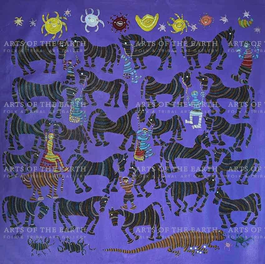 Lado Bai was born in the 1950s in Jhabua District, Madhya Pradesh, in central India. Like Jangarh Singh Shyam, she was discovered by Jagdish Swaminathan during his travels searching for artists in the tribal areas of Madhya Pradesh. Her paintings celebrate the flora and fauna in a melee of brightly colored motifs, each a manifestation of primal energy. The human beings in her works appear entranced as they participate in a cosmic dance. The figures on the canvas are like the characters in an opera or reciting an ode to nature.