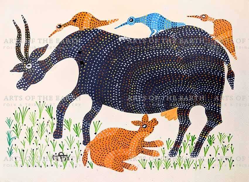 She has been part of several group exhibitions such as ‘Creative Customs: International Folk Art,’ Peninsula School of Art, USA (2016); ‘water+wisdom Australia-India,’ Royal Melbourne Institute of Technology, Australia; and solo shows such as ‘Merging Narratives,’ Ojas Art Gallery, Delhi (2022). Her works are part of several prestigious art collections, such as the Indira Gandhi National Center for the Arts, Saffronart in Mumbai, the National Handicrafts and Handlooms Museum in New Delhi, and the Sutra Gallery in Wisconsin, USA. In 2017 she received the Master Ojas Art Award at the Jaipur Literature Festival, solidifying her position as a leading figure in the Bhil art movement. The Indira Gandhi National Center for the Arts, Saffronart in Mumbai, the National Handicrafts and Handlooms Museum in New Delhi, and the Sutra Gallery in Wisconsin, USA. She is currently based in Bhopal.