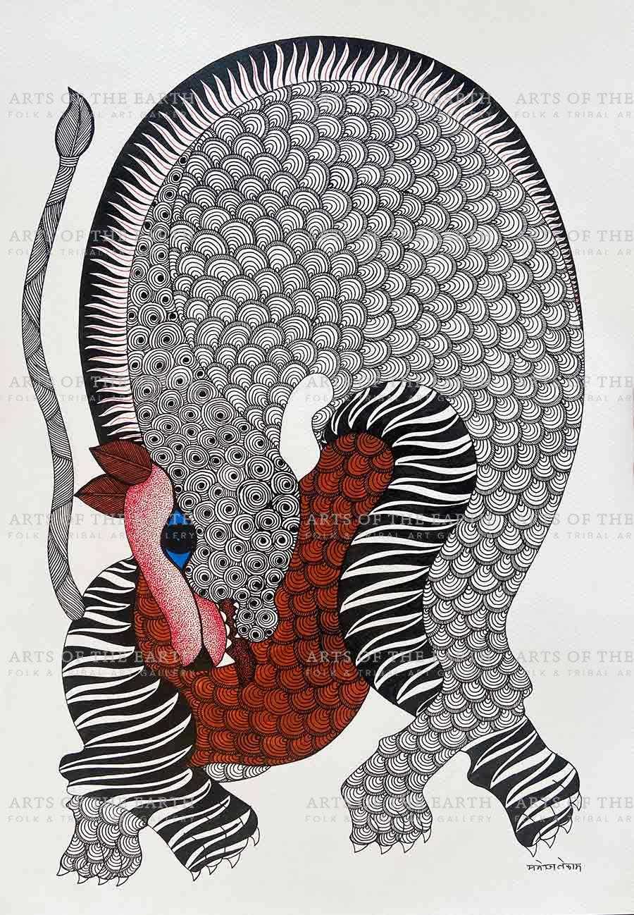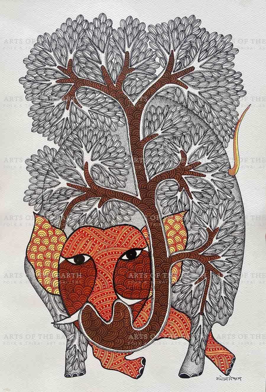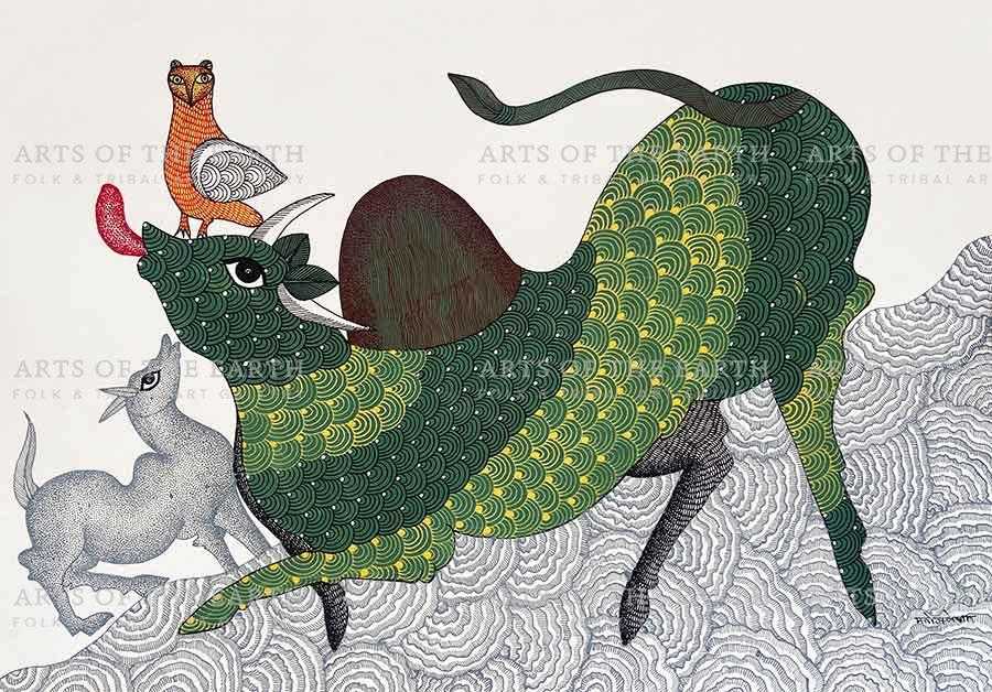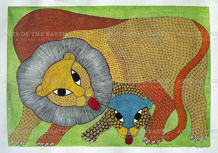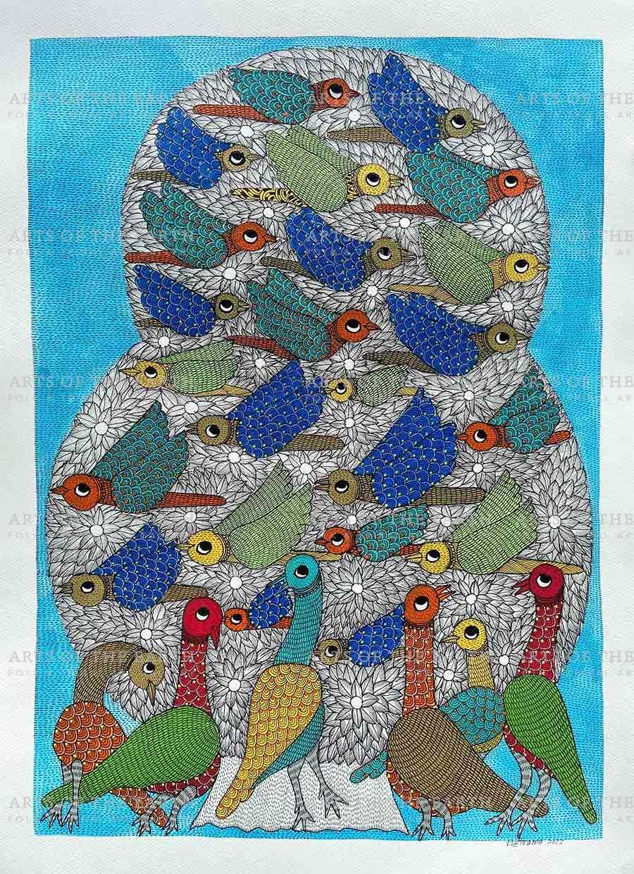 The Gonds are a tribal community widely spread over Madhya Pradesh, Chattisgarh, and also some parts of Maharashtra, Andhra Pradesh and Orissa. Gonds call themselves Koi or Koitur, which means unclear. They are one of the largest tribes of India. Gonds have been greatly influenced by the culture and traditions of the Hindus. They are worshippers of Janani. They also worship Pharsa Pen in the form of a nail or a piece of iron chain. Like the Santhals, the Gonds believe that everything in nature is inhabited by spirits and they need to be appeased with sacrifices. On such occasions, the priest or devari perform the necessary rituals. Gond paintings are created on the walls of their dwellings and besides being decorative, they are expressions of their religious beliefs and sentiments. The themes are closely linked with their daily lives, and depict their local festivals and Gods, as well as objects and creatures present around them. However, they have now started painting on paper and canvas as well. The painters use a technique creating textures with patterns. Gond paintings have an uncanny likeness to Australian aboriginal art. In both these art forms, the brush moves creating dots or lines as fillers. Gond paintings have great universal appeal.