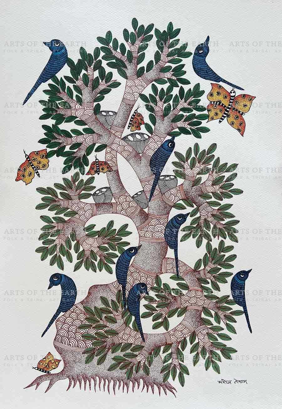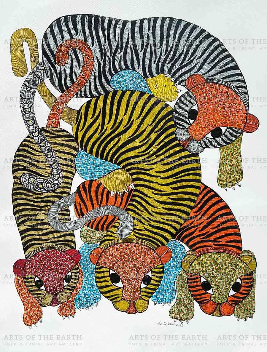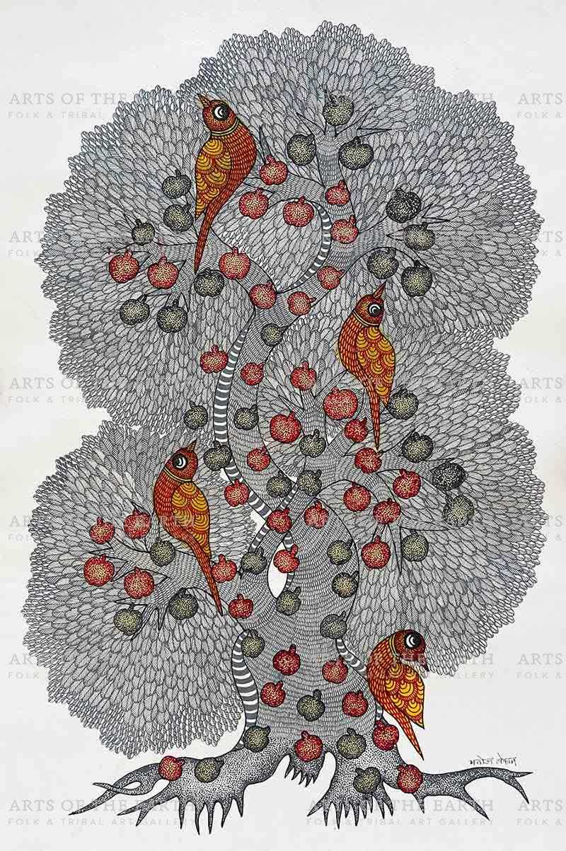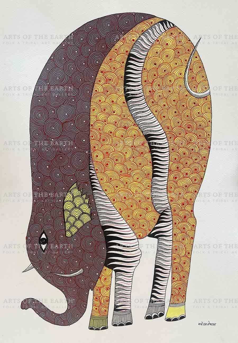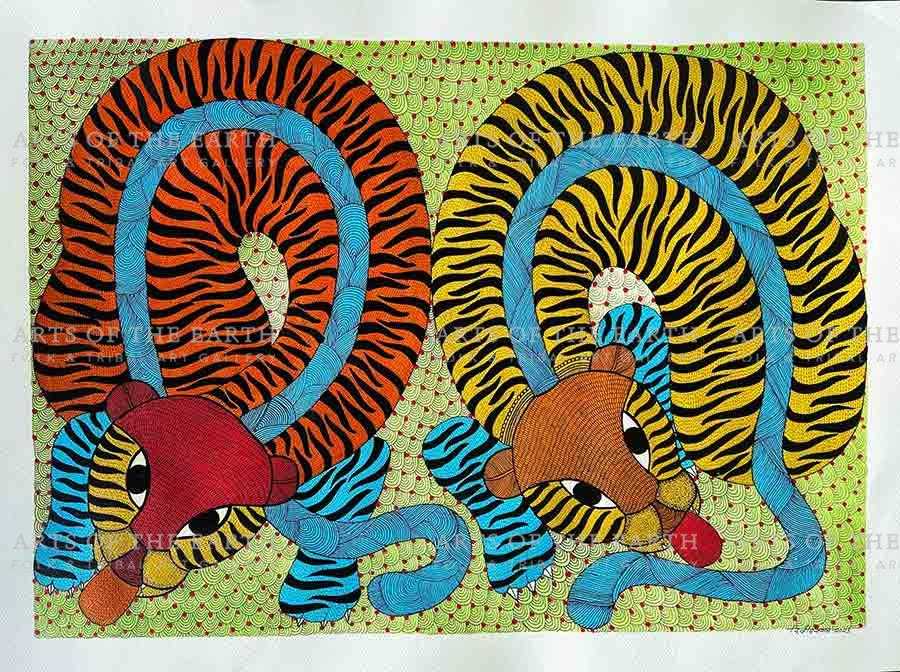 The Gonds are a tribal community widely spread over Madhya Pradesh, Chattisgarh, and also some parts of Maharashtra, Andhra Pradesh and Orissa. Gonds call themselves Koi or Koitur, which means unclear. They are one of the largest tribes of India. Gonds have been greatly influenced by the culture and traditions of the Hindus. They are worshippers of Janani. They also worship Pharsa Pen in the form of a nail or a piece of iron chain. Like the Santhals, the Gonds believe that everything in nature is inhabited by spirits and they need to be appeased with sacrifices. On such occasions, the priest or devari perform the necessary rituals. Gond paintings are created on the walls of their dwellings and besides being decorative, they are expressions of their religious beliefs and sentiments. The themes are closely linked with their daily lives, and depict their local festivals and Gods, as well as objects and creatures present around them. However, they have now started painting on paper and canvas as well. The painters use a technique creating textures with patterns. Gond paintings have an uncanny likeness to Australian aboriginal art. In both these art forms, the brush moves creating dots or lines as fillers. Gond paintings have great universal appeal.