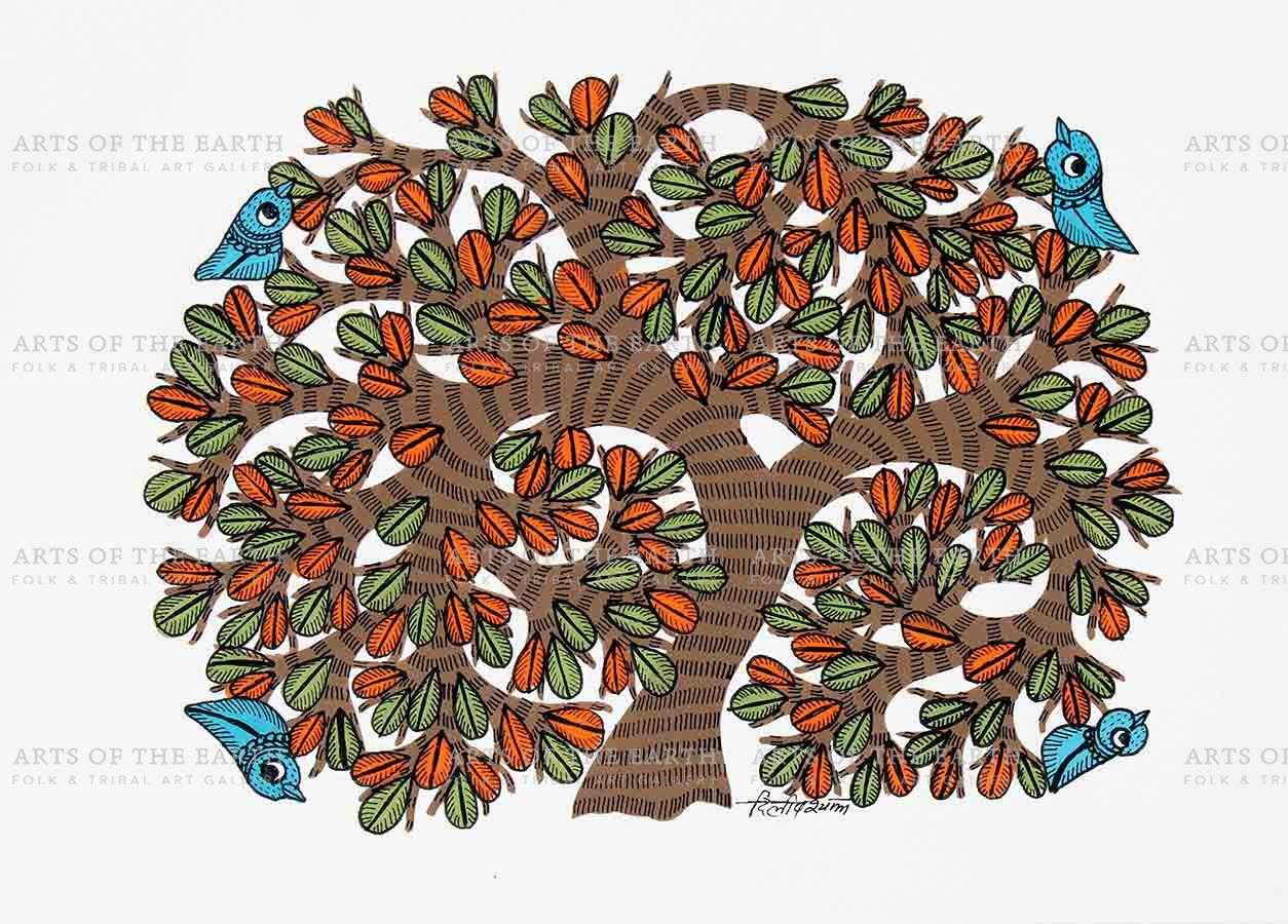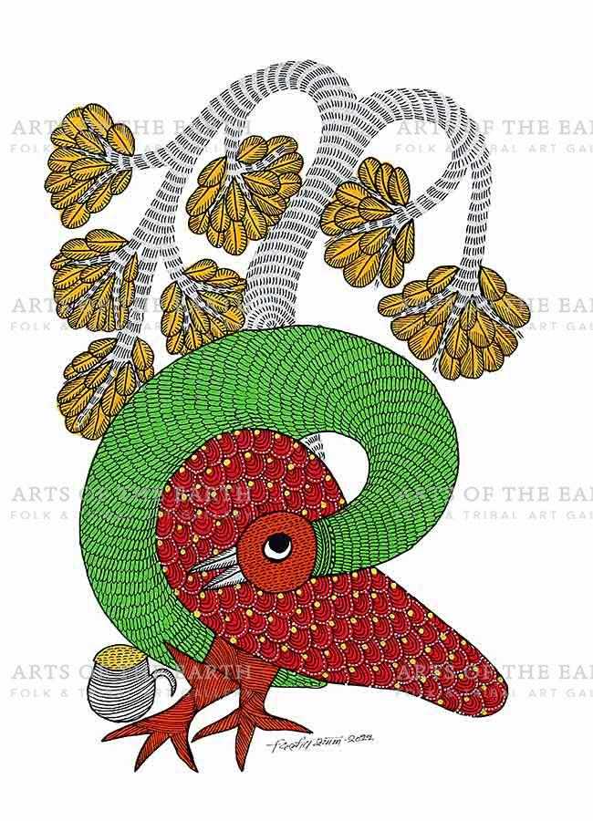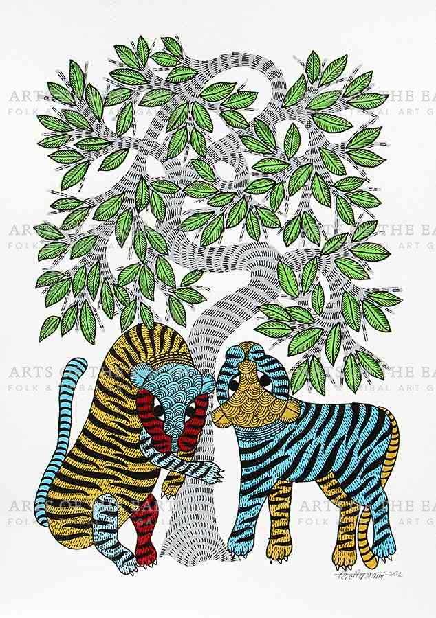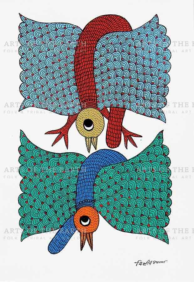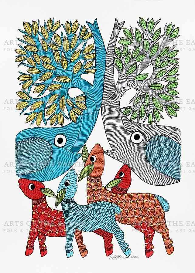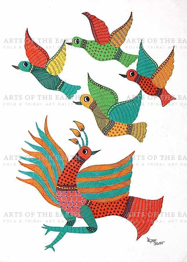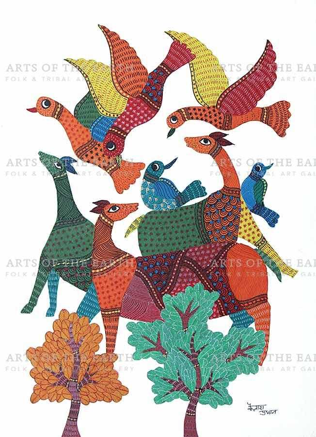 The Gonds are a tribal community widely spread over Madhya Pradesh, Chattisgarh, and also some parts of Maharashtra, Andhra Pradesh and Orissa. Gonds call themselves Koi or Koitur, which means unclear. They are one of the largest tribes of India. Gonds have been greatly influenced by the culture and traditions of the Hindus. They are worshippers of Janani. They also worship Pharsa Pen in the form of a nail or a piece of iron chain. Like the Santhals, the Gonds believe that everything in nature is inhabited by spirits and they need to be appeased with sacrifices. On such occasions, the priest or devari perform the necessary rituals. Gond paintings are created on the walls of their dwellings and besides being decorative, they are expressions of their religious beliefs and sentiments. The themes are closely linked with their daily lives, and depict their local festivals and Gods, as well as objects and creatures present around them. However, they have now started painting on paper and canvas as well. The painters use a technique creating textures with patterns. Gond paintings have an uncanny likeness to Australian aboriginal art. In both these art forms, the brush moves creating dots or lines as fillers. Gond paintings have great universal appeal.