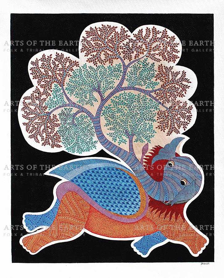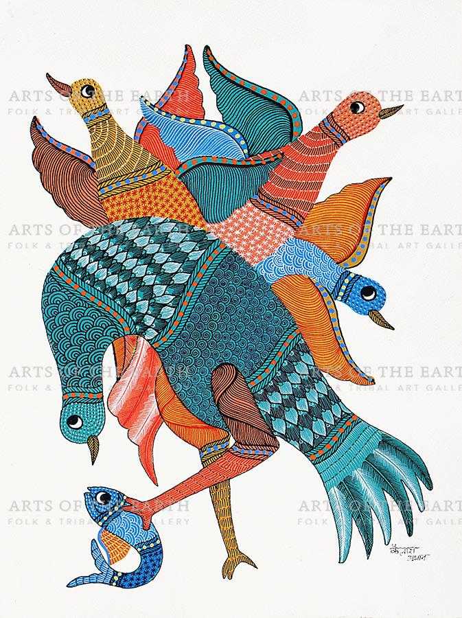 The Gonds are a tribal community widely spread over Madhya Pradesh, Chattisgarh, and also some parts of Maharashtra, Andhra Pradesh and Orissa. Gonds call themselves Koi or Koitur, which means unclear. They are one of the largest tribes of India. Gonds have been greatly influenced by the culture and traditions of the Hindus. They are worshippers of Janani. They also worship Pharsa Pen in the form of a nail or a piece of iron chain. Like the Santhals, the Gonds believe that everything in nature is inhabited by spirits and they need to be appeased with sacrifices. On such occasions, the priest or devari perform the necessary rituals. Gond paintings are created on the walls of their dwellings and besides being decorative, they are expressions of their religious beliefs and sentiments. The themes are closely linked with their daily lives, and depict their local festivals and Gods, as well as objects and creatures present around them. However, they have now started painting on paper and canvas as well. The painters use a technique creating textures with patterns. Gond paintings have an uncanny likeness to Australian aboriginal art. In both these art forms, the brush moves creating dots or lines as fillers. Gond paintings have great universal appeal.