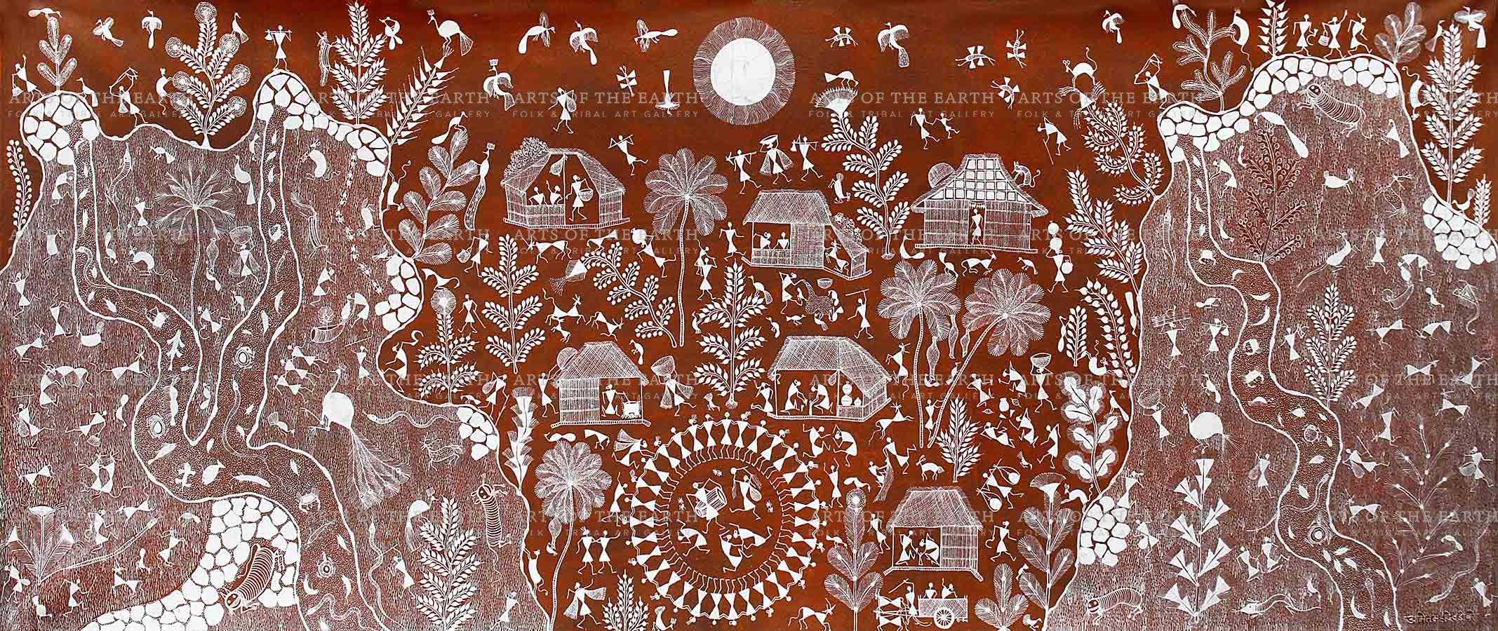 Warli art is a traditional tribal painting style native to the Warli tribe in Maharashtra, India. This iconic art form dates back centuries and is deeply rooted in the cultural and spiritual life of the Warli people. Known for its minimalistic beauty, Warli paintings are typically created on mud walls or handmade paper using natural pigments like rice paste for the signature white figures and symbols. The artwork predominantly features geometric shapes such as circles, triangles, and squares to depict human figures, animals, trees, and other elements of nature, showcasing a deep connection to the environment.
