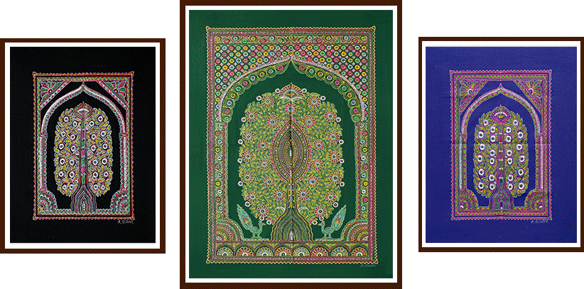 Rogan painting, is an art of cloth printing practiced all over Gujarat, Peshawar and Sindh. In this craft, paint made from boiled oil and vegetable dyes is laid down on fabric using either a metal block (printing) or a stylus (painting). The craft nearly died out in the late 20th century, with rogan painting being practiced by only a few families in Qissa Khwani bazar of Peshawar in Pakistan and Gujrat of India. The name itself means oil and is borrowed from Persian into Urdu. Rogan paint is produced by boiling castor oil for about two days and then adding vegetable pigments and a binding agent; the resulting paint is thick and shiny.[10] The cloth that is painted or printed on is usually a dark color, which makes the intense colors stand out. In rogan printing, the pattern is applied using metal blocks with patterns carved into them. In rogan painting, elaborate designs are produced freehand, by trailing thread-like strands of paint off of a stylus. Frequently, half of a design is painted, then the cloth is folded in half, transferring a mirror image to the other half of the fabric. The designs include floral motifs, animals, and local folk art.